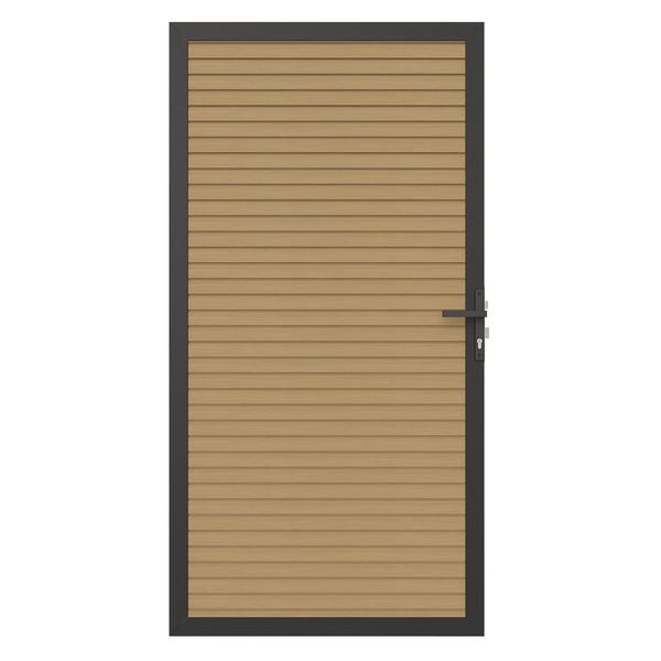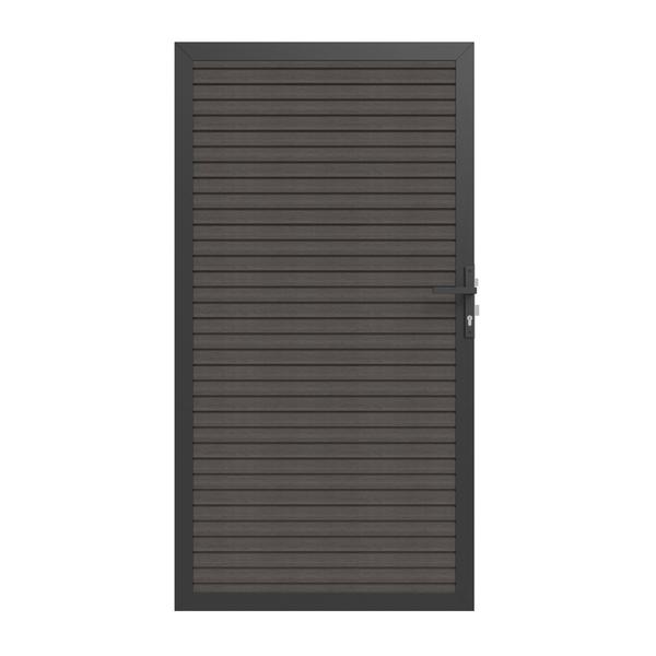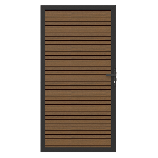 De deuren zijn voorzien van een aluminium frame, composiet schermplanken, scharnieren en zwart deurbeslag. Te combineren met aluminium poortpalen, inclusief aanslaglat.